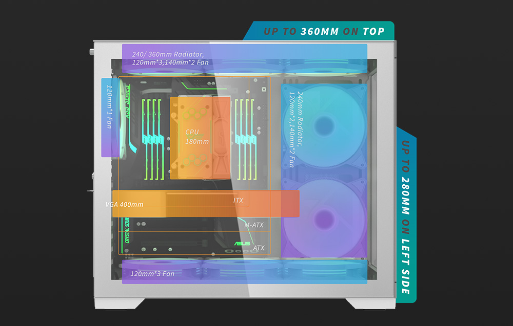 | Opcje montażu chłodzenia wodnego | Bok: chłodzenie wodne 240 mm; Góra: chłodzenie wodne 360 mm; |