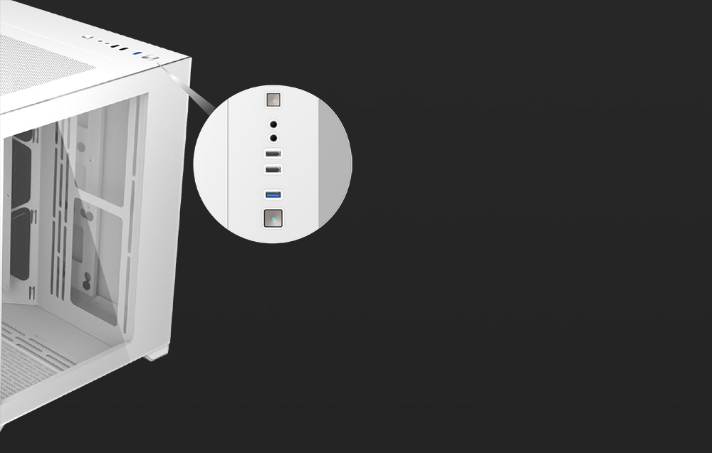 Korzystaj z dostępnych portów i ciesz się wygodną obsługą komputera. Obudowa C305 ATX została wyposażona między innymi w port USB 3.0, który pozwoli Ci na szybkie ładowanie podłączonych urządzeń. Umożliwi też przesyłanie plików w krótszym czasie. Dostępne są również 2 porty USB 2.0, wyjście słuchawkowe, wejście mikrofonowe, a także przyciski Reset i Power.